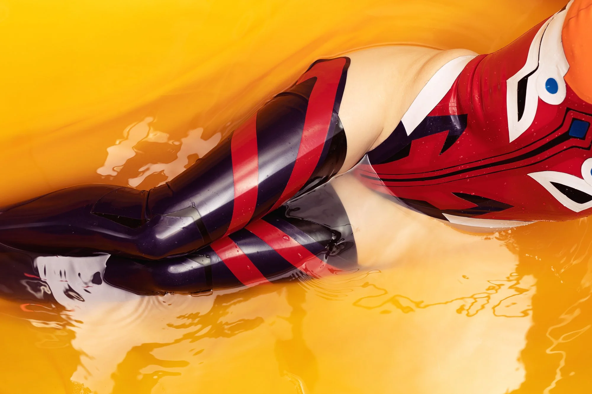 One day, I’m going to make a full, proper plug suit. (I haven’t quite had access to all of the things I wanted before, but I actually think I’m approaching having all the right tools, finally.) But this was a try at practicing a few things: underlay, the multicoloured gloves, and the thick collar, as well as the thigh highs where the sides stand up without any garter straps of any kind.